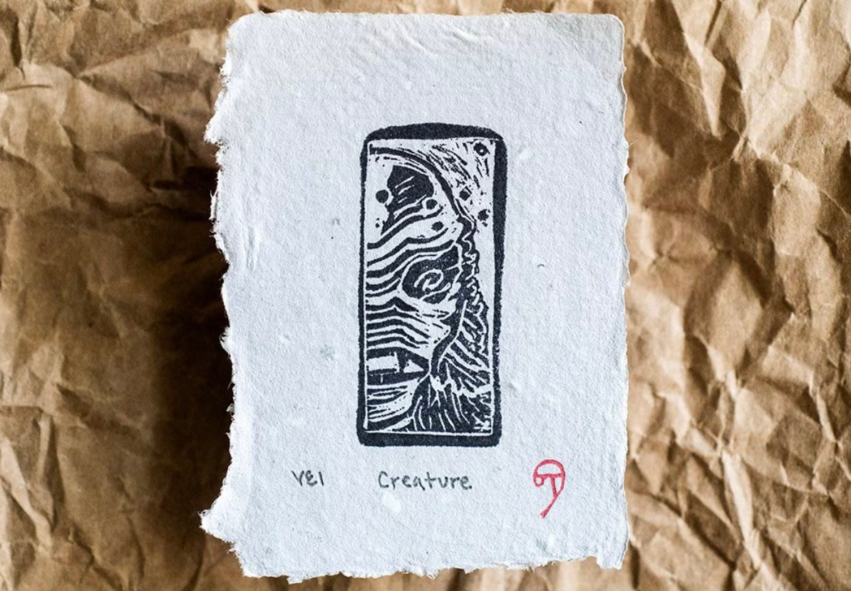 “Well, it was one of my first prints that I did up at the cottage when I did my first weekend of ‘I’m just going to grab some erasers,’ and I brought my linocutting carver, and I was going to follow in the steps of Serena at Cactus Cloud Art and she had inspired me to try this out because she was having such a fun time with it, and I…that’s why I did it because I started out making monsters because I was like ‘I don’t know what to do, I’ll just start making monsters.’”