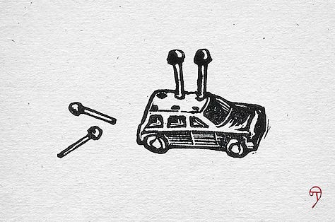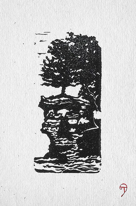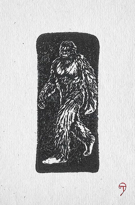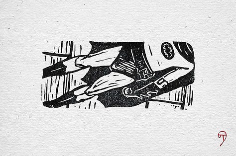 I'd like to start by thanking Ken Foster, our KK, for reading "The Wheel," and re-reading it, and re-reading it again. He's the first to ask to read my writing and the first to actually do so. (I promise you can read "Gull Island" as soon as I have time to do so.) He's the first to give me feedback and was always the first to respond to those early Substack posts when I was still just a boy in the world, trying to figure out what I was hoping to do here. Thanks to my mom, Sharon Foster, for reading the early draft, “liking” every post while reading it again here, and putting up with Jack's sometimes potty mouth, and by extension, my own. Thanks to my amazing wife, Jenelle, for making this "published" version of the story feel so beautiful and legitimate with her masterful linocut art. (I also dedicated this story to her for reasons I discussed HERE.) Without my sons, Clyde and Archie, I would never have written Justin. I love them immensely, even if they still start every sentence with “Hey Dad?” Thanks to Aaron Howard for crying at the ending—if this story ever had a goal, it was to make Aaron cry, and the moment that I got the unsolicited text saying that he did, I considered it a success.